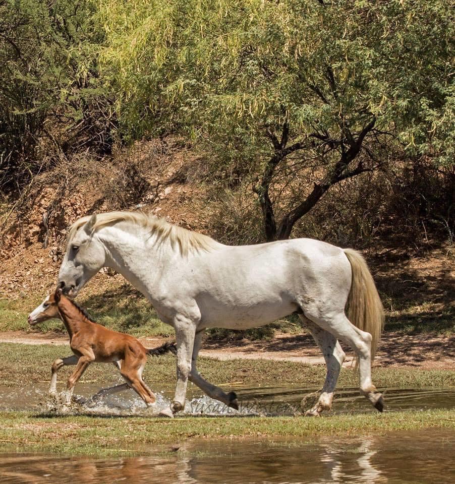 SRWHMG has recorded 14 offspring of Shadowfax over the years. Of which 3 died from natural causes, 2 were rescued due to extreme situations (Diamond and Gem), and 9 are happily living along the lower Salt River. The newest one being a young filly named Jewell, born this year.
