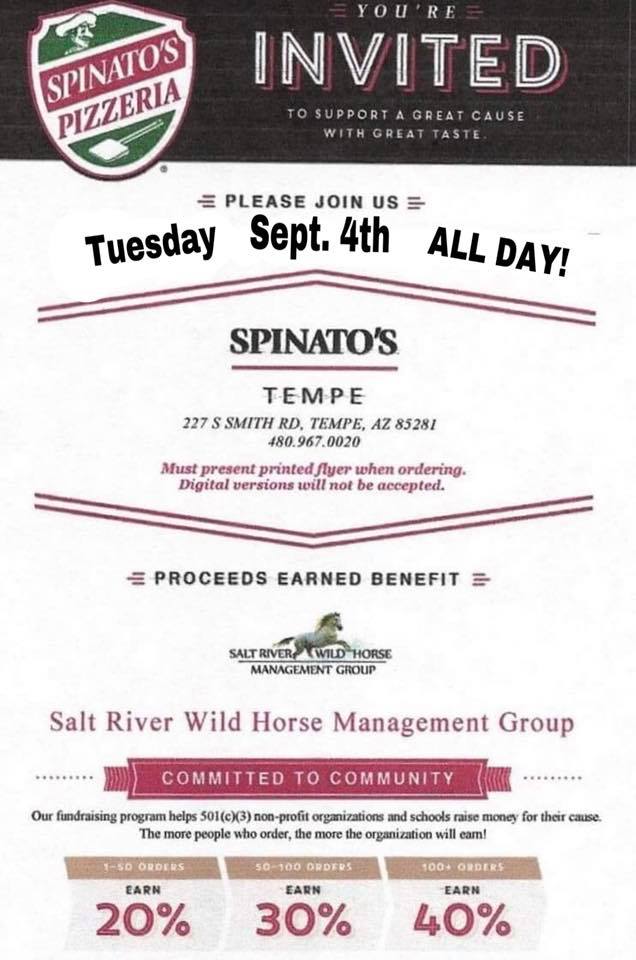 On September 4th come enjoy some great food and support our favorite wild horses and SRWHMG volunteers at the Spinato’s in Tempe. Talk about an easy decision that feels good all around! Don’t forget to bring a printed copy of the flier and be sure to thank Spinato’s personally for their generosity and proving their commitment to community. We hope to see you there and appreciate your support!