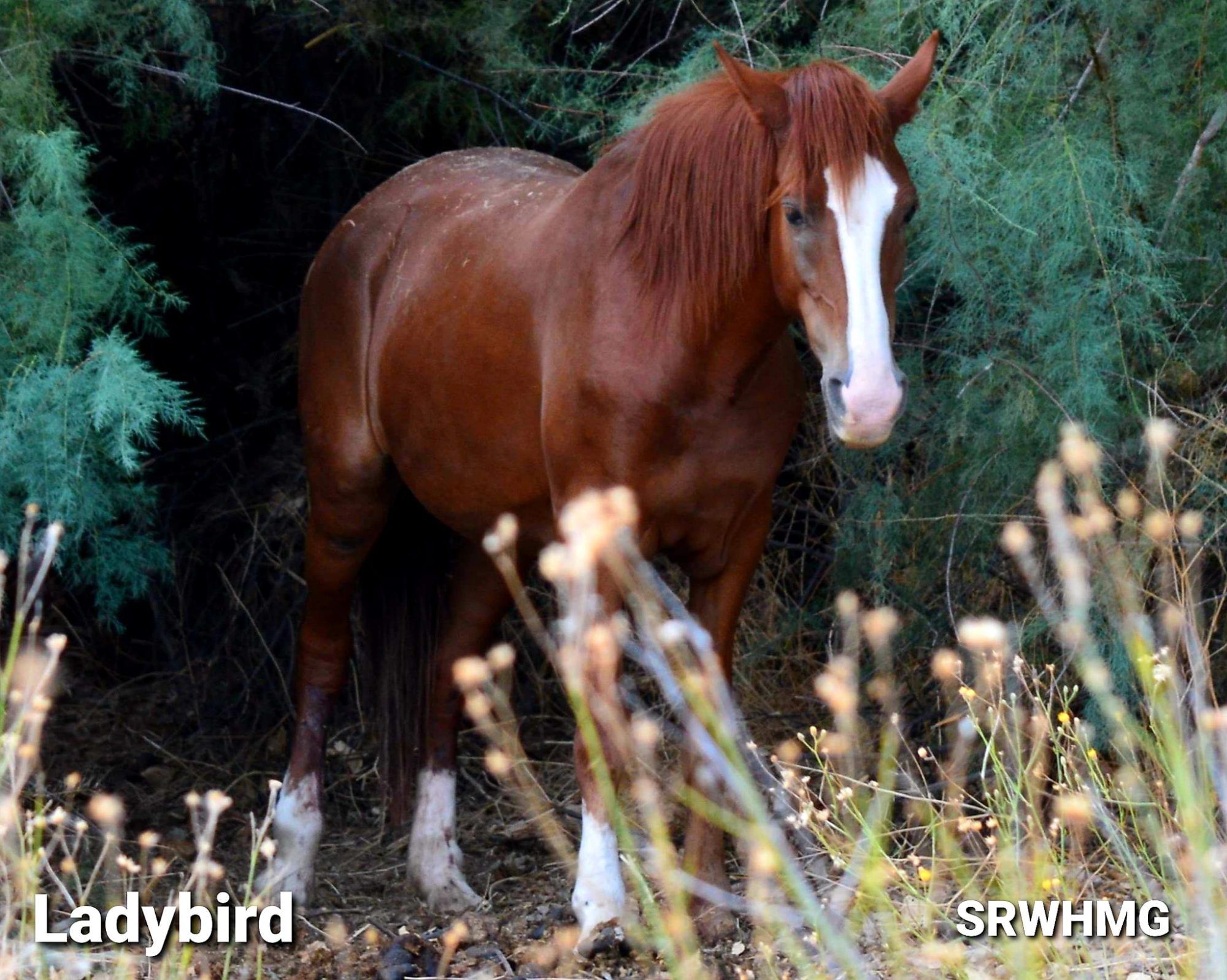 Ladybird has been with her band stallion Tex since 2012. She has 8 offspring, of which 3 are deceased and 5 are alive and well. 2 of them are great big lead stallions: Jay and Houston. Ladybird has a 2019 foal we named Raven who is hopefully still with the band. She is for sure missing her mom. Ladybird does not have a 2020 foal and is not currently pregnant, because she has been treated with fertility control PZP.
